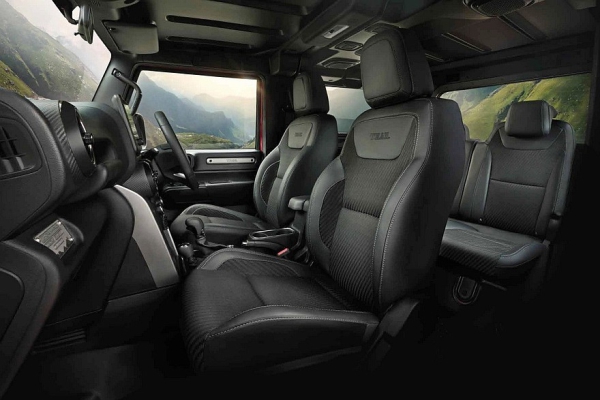 Интерьер переработан чуть более тщательно. Внутри Mahindra Thar – руль от пятидверного Thar Roxx, от удлиненной же версии богатым комплектациям трехдверки достался планшет мультимедиа диагональю 10,25 дюйма (раньше был тачскрин на 6,7 дюйма). На передних стойках появились ручки, кнопки стеклоподъемников перенесли с центрального тоннеля на двери. Еще добавили воздуховоды для задних пассажиров (встроены в торец тоннеля). Наконец, в список оборудования вошли USB-разъемы Type-C и камера заднего вида.