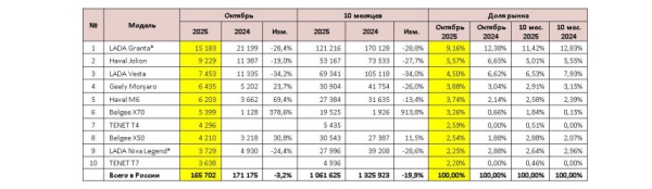 Первую строчку в рейтинге марок традиционно удерживает Лада, реализовавшая 33251 машину, но ее рыночная доля снизилась с прошлогодних 26% до 20% в минувшем октябре. На втором месте вновь оказался Haval (26125), а на третьем — Geely (14238). Белорусский бренд Belgee (10780) впервые преодолел отметку в 10 тыс проданных автомобилей и сохранил четвертую строчку. Самое крутое пике в первой десятке продемонстрировала марка Chery (6566) — падение сразу на 56,6% и шестое место. Зато постепенно замещающий ее бренд Tenet, чьи продажи начались лишь в августе, уже может похвастать пятой строчкой рейтинга и 8632 проданными автомобилями. Третий месяц подряд в десятку лидеров входит Toyota (4165), которая не представлена в России официально.