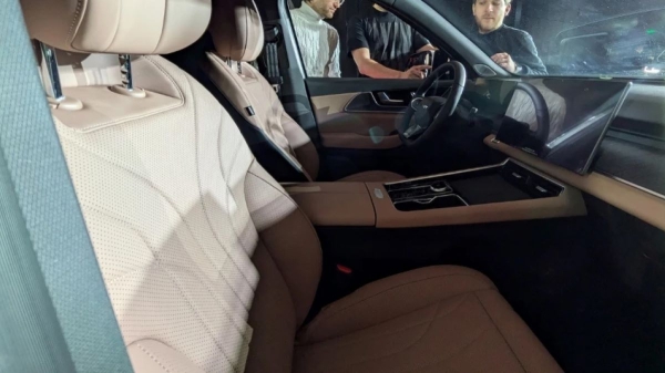 Интерьер Tenet T9 сложно назвать уникальным. Через окна выставочного предсерийного экземпляра видны знакомые по Tiggo 9 10,3‑дюймовый экран приборной панели и 15,6‑дюймовый тачскрин мультимедийной системы, расположенный над высокой центральной консолью с площадкой для зарядки смартфонов. Мультируль с логотипом Tenet соседствует с подрулевым селектором АКПП.