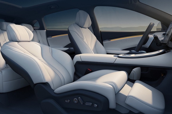 Единственное значимое новшество в пятиместном салоне гибрида – переднее пассажирское кресло с откидной подставкой для ног. Привычной приборки внутри нет – ее роль выполняет проекционный дисплей с дополненной реальностью. По центру установлен крупный планшет мультимедийной системы, еще один экран встроен в торец тоннеля. Паркетник также имеет искусственный интеллект и автопилот.