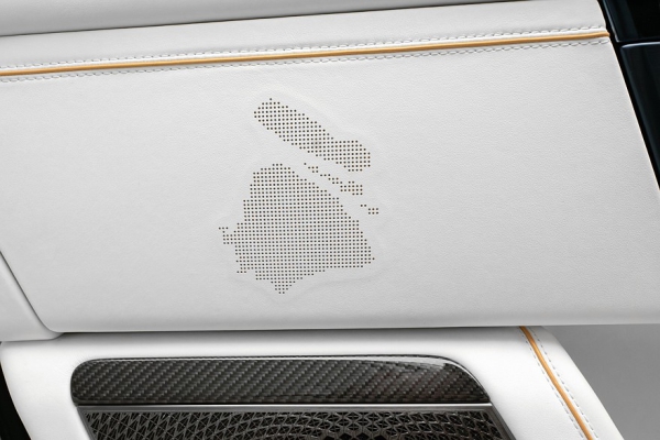 Салон заново обшит белой кожей с художественной перфорацией и контурными вставками золотого цвета. Контрастные чёрные вставки из карбона есть на передней панели, центральной консоли, дверных карах и даже на педалях. Пассажирская часть салона полностью переделана: здесь теперь не четыре, а только два кресла оригинальной конструкции с огромным количеством регулировок. Эти кресла сдвинуты максимально назад и находятся наполовину в багажнике, между ними разместилась высокая многофункциональная тумба-подлокотник с сенсорным экраном в виде трамплина. Для еды и напитков предусмотрен холодильник.