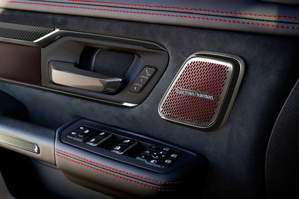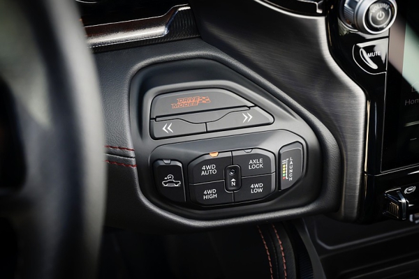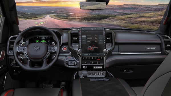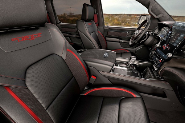 Салон Ram 1500 SRT TRX тоже в целом выглядит по-старому, но улучшены материалы отделки (кожа, замша, алюминий, углепластик) и электронные ассистенты водителя — масл-тракт теперь имеет автопилот второго уровня по классификации SAE, то есть водитель может при определённых условиях убирать руки с руля. Приборный 12,3-дюймовый экран дополнен 10-дюймовый проекционным экраном на лобовом стекле. 14,5-дюймовый сенсорный экран мультимедийной системы Uconnect 5 окружён физическими клавишами, отвечающими за основные настройки, а под этим экраном появились два слота с беспроводной зарядкой для смартфонов. Штатная 900-ваттная аудиосистема Harman Kardon насчитывает 19 динамиков и один 10-дюймовый сабвуфер. Передние сиденья уже в «базе» оснащены подогревом, вентиляцией и массажёрами, а задний диван снабжён подогревом и вентиляцией.