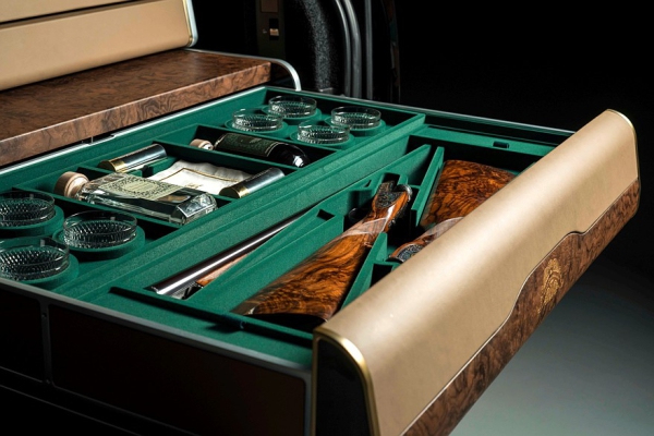 В багажнике друг над другом размещены два кофра ручной работы из кожи и дерева. В верхнем кофре хранится набор для распития шампанского на восемь персон — хрустальные бокалы, штопор из оленьего рога и скатерть с вышивкой ручной работы. В нижнем кофре есть отсек для хранения двух дробовиков Holland & Holland и набор для распития виски — восемь стаканов, графин, две фляжки в виде патронов и скатерть. Короче говоря, складывается такое ощущение, что охотники едут на природу в основном пить, нежели стрелять в птичек.