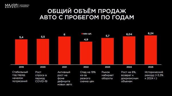 В ходе пресс-мероприятия представители деловых и автомобильных СМИ обсудили нынешнюю трансформацию вторичного авторынка и выявили факторы, которые предположительно будут определять развитие сегмента в ближайшие несколько лет. По словам Давида Павлова, руководителя отдела продаж MajorExpert (вошел в тройку крупнейших официальных дилеров РФ по реализации «вторички»), по итогам 2025 года рынок машин с пробегом в России достиг исторического максимума и составил 6,24 млн сделок.