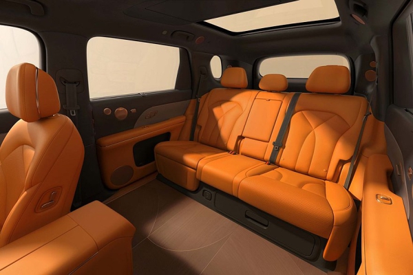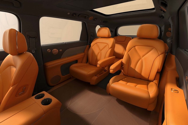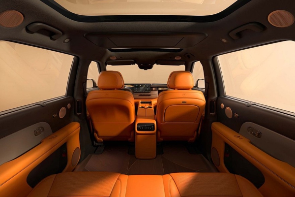 Перед водителем установлено табло диагональю 27,1 дюйма, которое совмещает функции приборки и мультимедийной системы. Со стороны пассажира – встроенный в переднюю панель тачскрин на 15,6 дюйма. Для задних седоков предусмотрен собственный «потолочный» дисплей размером 21,5 дюйма. В торце центрального тоннеля есть выдвижной бокс с функциями подогрева и охлаждения.