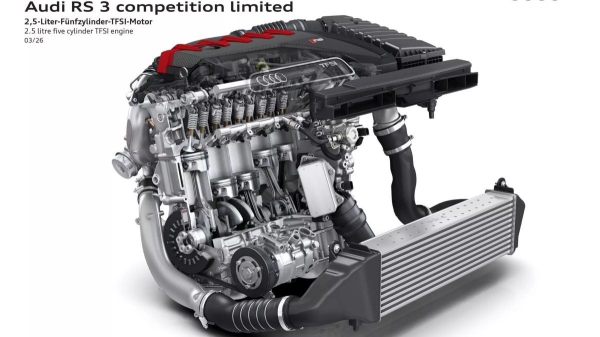 Audi RS 3 Competition Limited обрела новый обвес кузова с компонентами из матового карбона, раздельный передний сплиттер и иной задний спойлер. Для окраски кузова предложено всего три цвета: оригинальные зеленый Malachite и матово-белый Glacier, а также уже знакомый серый Daytona. Юбилейному исполнению досталась эффектная пасхалка. Световой рисунок в матричных фарах при включении повторяет последовательность работы цилиндров: 1-2-4-5-3. Сквозь спицы матовых золотистых колес диаметром 19 дюймов виднеются красные тормозные механизмы.