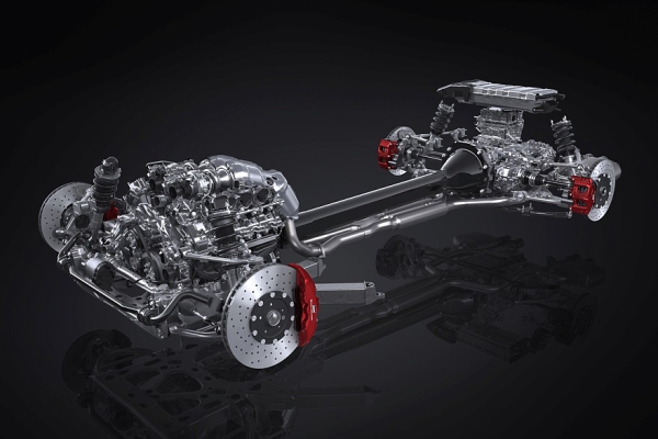 Снаряженная масса дорожной версии суперкара не должна превышать 1750 кг — это довольно много, но такая масса объясняется тем, что V8 здесь является частью гибридной силовой установки, а такие машины всегда тяжёлые. GR GT имеет перене-среднемоторную компоновку типа transaxle: двигатель V8 установлен спереди продольно, но строго за передней осью, а коробка передач отнесена к задней оси для получения оптимальной с точки зрения управляемости развесовки — 45:55 в пользу задней оси.