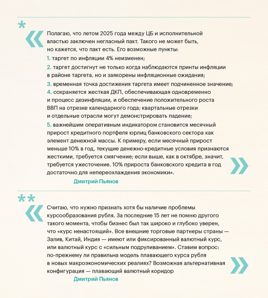 «Считаю, что нужно признать хотя бы наличие проблемы курсообразования рубля. Все внешние торговые партнеры страны — Залив, Китай, Индия — имеют или фиксированный валютный курс, или валютный курс с «сильным подруливанием». Ставим вопрос — по-прежнему ли правильна модель плавающего курса рубля в новых макроэкономических реалиях?» — пояснил свою позицию Пьянов.