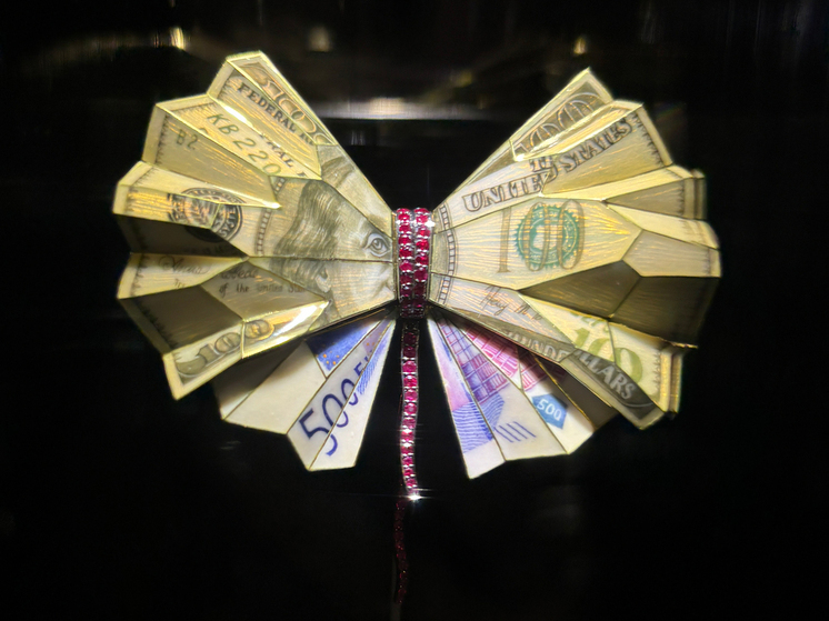 Чего точно не ожидаешь на выставке с таким названием, так это политические вопросы, которые поднимаются на крыльях бабочек. №33 (так называется экспонат) из золота, рубинов и горячей ювелирной эмали сопровождается фразой: «Мы погружены в игру, выйти из которой не в состоянии. Игра будет бесконечной, если мы будем позволять играть с нами». Крылья бабочки сделаны из стодолларовой и пятисотевровой купюр, но смятых, как фантик для игры с котенком — намек на то, что все мы являемся частью большой мировой политической и экономической игры.
