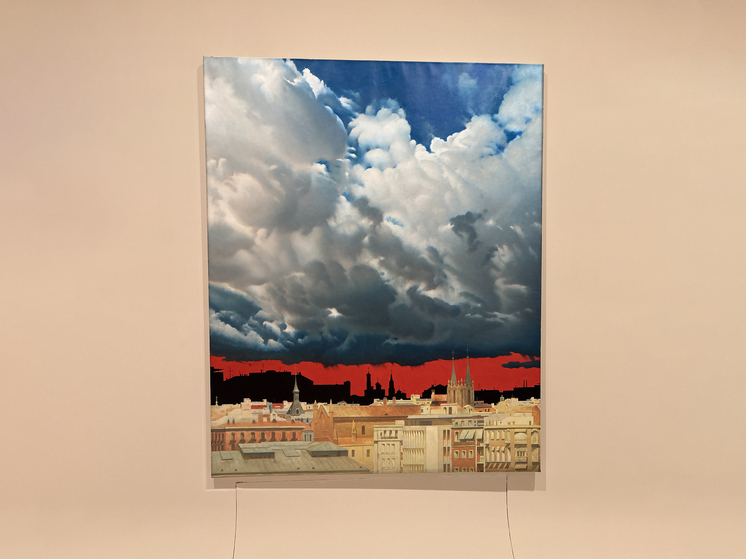 «Вид Москвы из Мадрида» — черный силуэт Первопрестольной виднеется на горизонте, а небо над Москвой красное. Подсказка, что происходит, кроется в дате создания работы — 1991-й год: августовский путч.