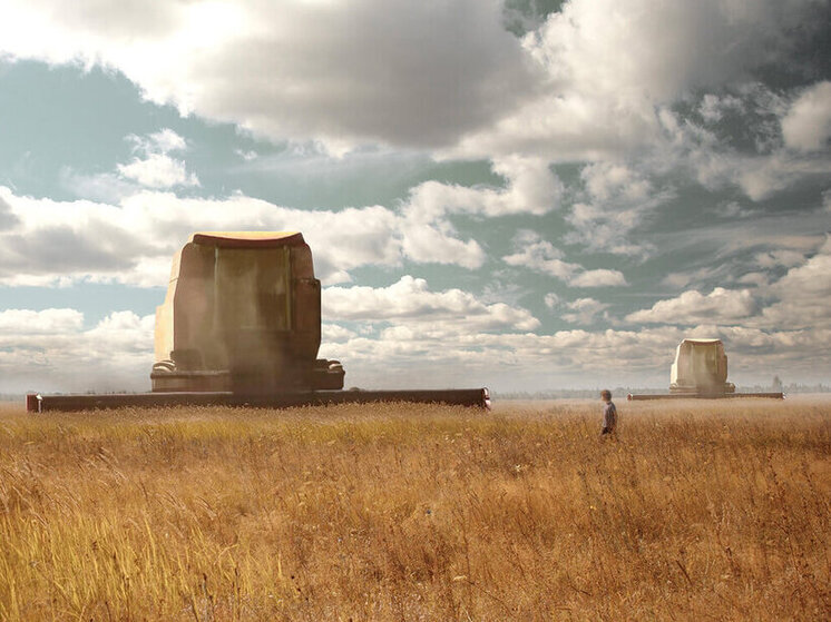 Поезда навеки встали на железнодорожных путях. Поля еще колосятся, хотя жатва прошла. Застыли комбайны, похожие на агропромышленные гиганты, инфернальные космические корабли. Почти как в «Империи» Брюно Дюмона, где прилетали на Землю готические соборы. Зрелище эффектное, но леденящее.