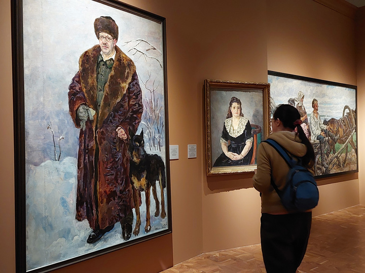 В нынешней экспозиции есть хорошо известные произведения «Семейный портрет (на фоне китайского панно)» и «Семейный портрет. «Миша, пойди за пивом», где изображен сам Кончаловский с женой Ольгой, дочерью художника Василия Сурикова и детьми Натальей и Михаилом. Есть несколько автопортретов — в сером, с бритвой, с собакой, где художник запечатлел себя в полный рост в роскошной шубе на фоне снежного пейзажа, а также портреты дочери, как совсем маленькой, в матроске, так и уже взрослой. Особенно Наталья Петровна хороша в розовом платье на портрете 1925 года, где она склоняется к своей туфельке. Рядом — портрет ее матери Ольги Васильевны в красном и с ниткой длинных бус.