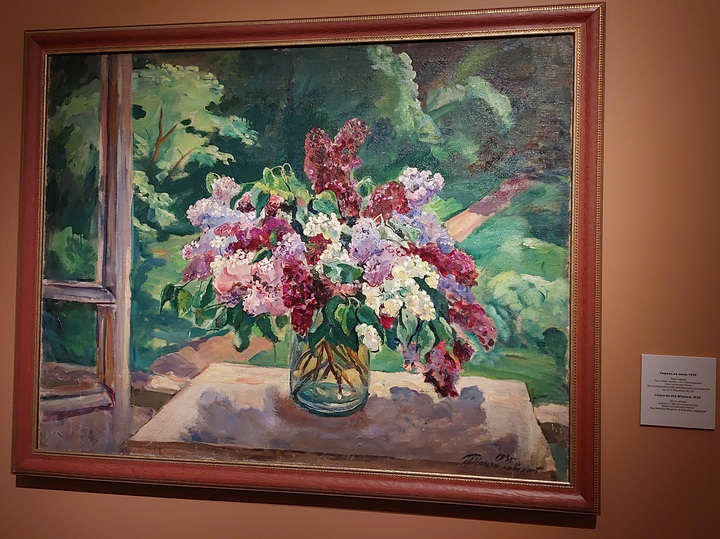 Посетителей встречает «Сирень на окне» 1935 года из Волгоградского музея им. И.Машкова. А завершается путешествие в зале цветов, где преобладает сирень, разбавленная «Утром испанских пионеров в летнем лагере» с указанием на латинице имен мальчиков на обороте холста. Испанская тема начинается чуть раньше «Испанками» 1937 года из собрания В.Некрасова, где, опять же, за натюрмортным столом с фруктами сидят яркие, полыхающие красками женщины, ставшие волею судеб временно или навсегда нашими соотечественницами.
