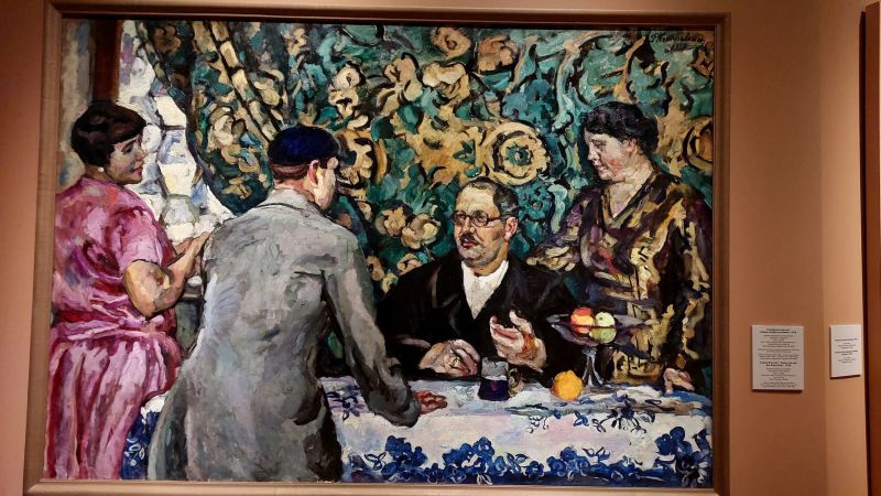 Есть на выставке и знаменитые портреты Сергея Прокофьева, Всеволода Мейерхольда с собакой, написанный за два года до его смерти, где режиссер-новатор прилег на кушетку, покрытую ковром. Неизменно привлекает посетителей Алексей Толстой, которого Кончаловский запечатлел в собственном доме. Писатель сидит за хлебосольным столом со знаменитой зеленой рюмкой. У художника есть живописная работа «Зеленая рюмка» 1933 года, где она узнаваема. Стол на многих портретах становится отдельным натюрмортом.