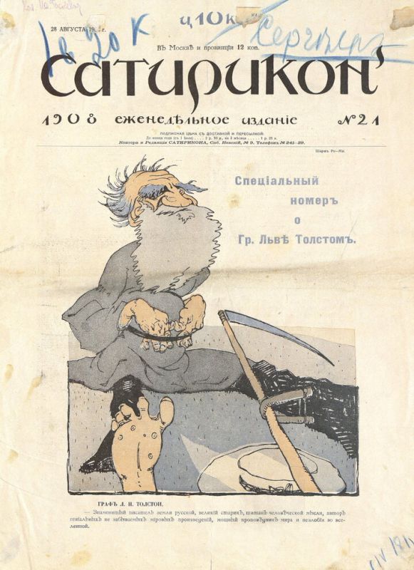Обложка журнала «Сатирикон» 1908 года, граф за работой в поле. Фото предоставлено Государственным музеем Л.Н. Толстого.