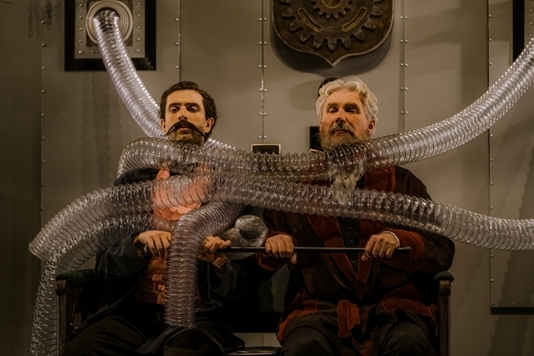 Но и это не самое главное. После антракта в целом реалистическая пьеса, наполненная пустяковыми деталями, – вот русские любят щи, чтобы ложка стояла, малосольные огурчики и водку, а французы – водянистый суп и шампанское, вот они не могут русскую букву «Щ» произнести — превращается в фантасмагорию. И Розовскому нужно отдать должное – в кровососущую машину со зловещими глазами-прожекторами, горящими красным и длинными алчными щупальцами-«хоботками», как в голливудском фильме о кровопийцах-марсианах, его команда явно вложилась. В начале спектакля ничего подобного не ожидаешь, даже после первых упоминаний об «оборотнях, сосунах, вуйдалаках» (коррумпированных и просто надеющихся выслужиться по итогам скандального дела чиновниках). Но сцена буквального кровососания из тел героев (хорошо, хоть алая жидкость не идет по трубам) есть один в один в «Смерти Тарелкина», где описывается монстр-упырь, питающийся «теплою… человеческою крррровью»: