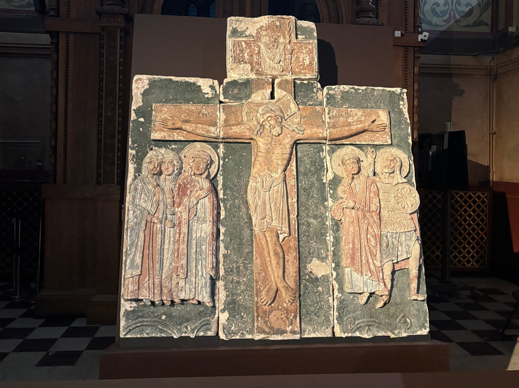 В центре всеобщего внимания — камень с изображением части креста и нимба Иисуса Христа, «Святославов крест» 1220-х годов из Юрьев-Польского историко-архитектурного и художественного музея. Это «Распятие» происходит из Георгиевского собора XIII века, полностью оттуда сохранилась лишь эта композиция, и, по словам историков, это «Распятие» находилось в нижней части храма и выполняло роль поклонного креста. Но ценность креста не только в древности и сохранности. Перед нами скульптура, от которой многие из нас не привыкли ждать выразительности или эмоциональности — и очень зря. Присмотритесь к лицу Христа: на нем — абсолютное смирение и даже мягкая улыбка…