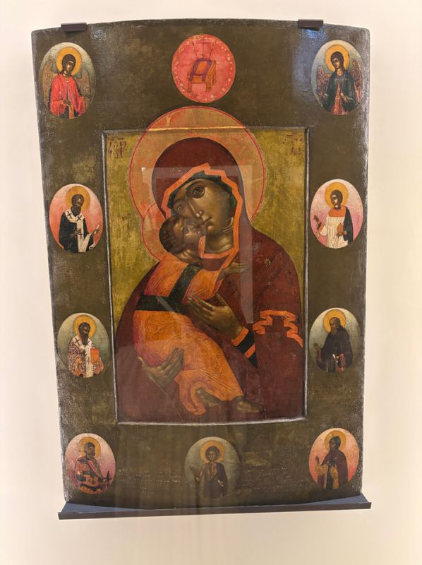 Прежде всего небольшая экспозиция интересна и ценна для «гостей столицы» — из коллекции Владимиро-Суздальского музея-заповедника приехал самый ранний список иконы Боголюбской Божией Матери XVI века, икону создали по заказу Андрея Боголюбского. Еще одна потрясающая вещь, от которой сложно оторвать взгляд, — икона Владимирской Божией Матери, которую князь Андрей Юрьевич перенес из Киевского княжества во Владимир, но здесь требуется комментарий. Когда князь Андрей возвращался от отца из Киева в Суздаль, он взял с собой чудотворную икону, которая когда-то прибыла в Киев из Константинополя. Согласно летописи, в дороге Андрею Юрьевичу явилась Богородица и дала наказ построить каменную церковь во имя Рождества Богородицы, и чтобы там была обитель для иноков. Чудо произошло в местечке, которое сегодня мы все знаем под названием Боголюбово. Список, представленный на выставке, создан Симоном Ушаковым и его учеником Андреем Владимировым.