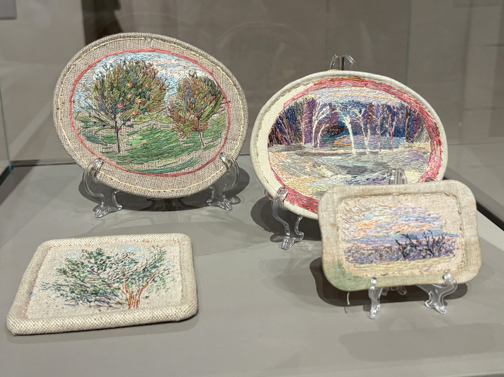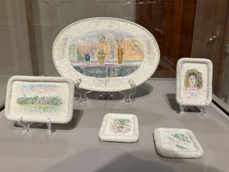 Но вернемся к выставке, которая достойна внимания, несмотря на свою камерность и скромность. В центре внимания — фигура художницы-монументалистки Александры Лукашевкер. Ее творческий путь — яркий пример того, как печальные и даже трагические жизненные обстоятельства можно трансформировать себе во благо. Известно, например, что она приложила свою талантливую руку к мозаикам московского метро, но гораздо важнее оказалась другая сторона ее творчества. В 1980-е годы Александре Давыдовне поставили непростые диагнозы — катаракта и глаукома, заниматься любимым делом больше нельзя. Работать разрешили лишь с маленькими вещами (впрочем, только с ними это и было возможно); и художница нашла выход — вышивка! Но она не стала просто вышивальщицей, наделив распространенный вид рукоделия большим художественным достоинством. Ее работы, как отмечают коллеги, выполнены в живописной технике; несмотря на то, что это вышивка, каждый стежок напоминает прикосновение тончайшей кисти с краской к холсту, а не просто нить.