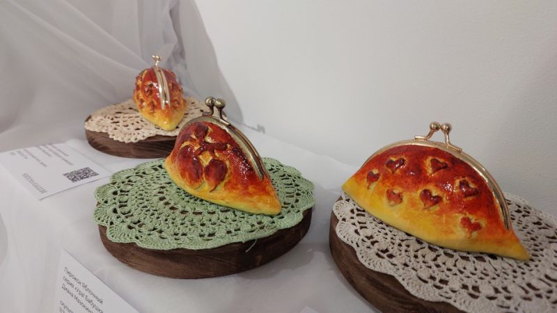 Из несъедобной еды здесь есть еще гипсовые кошельки-пирожки из серии «Ура! Бабушка приехала!» Дианы Мазокиной. Они выложены на вязанных крючком салфетках, создающих иллюзию закромов и старинной жизни. Стеклянные леденцы в форме петушков художницы Елизаветы Ильиной, нарисованные конфеты, ёлочные ягодки и птички, словно со страниц детского альбома, — все это пиршество только для глаз.