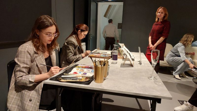 В первом же зале у нарядной елки выстроилась очередь из желающих получить собственное изображение в полный рост. Для этого молодым художницам понадобится совсем немного времени: семь минут – и небольшой портрет на бумаге готов.