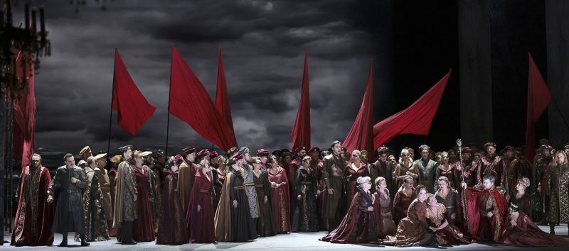 В противовес минималистичной в смысловом отношении сценографии, костюмы, созданные Габриелой Салаверри, — настоящее торжество красоты и исторической достоверности. Они напоминают ожившие полотна старых мастеров, радуя своим богатством, детальностью и аутентичностью. Эта смелость в сочетании несочетаемого — мрачной, условной сценографии и роскошных, детализированных костюмов — придает спектаклю особую парадоксальность. На этот же парадокс работает и реалистическая видеопроекция Серджио Металли, где бушующее море напрямую рифмуется со стихийными страстями, охватывающими героев.