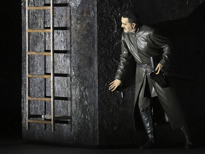 Режиссурой этого амбициозного спектакля занялся итальянский мастер Джанкарло дель Монако, уже хорошо известный московской публике по постановке «Риголетто». Вся постановочная группа — также из Италии, что подчеркивает не вполне обычный для нашего времени европейский характер проекта. Сценограф Антонио Ромеро создал пространство, которое поражает своей условностью и мрачностью, диссонируя с великолепием костюмов. Вместо аристократического кипрского быта и ожидаемой роскоши, зритель погружается в мир абсолютной абстракции. Давящие черные стены, лишь изредка прорезаемые зловещими красными линиями, символизируют бездонный, темный и губительный внутренний мир Яго, которым он уничтожает полный любви мир Отелло и Дездемоны. Яго в исполнении Эльчина Азизова – само воплощение зла. И как это бывает в искусстве –воплощение чрезвычайно харизматичное.