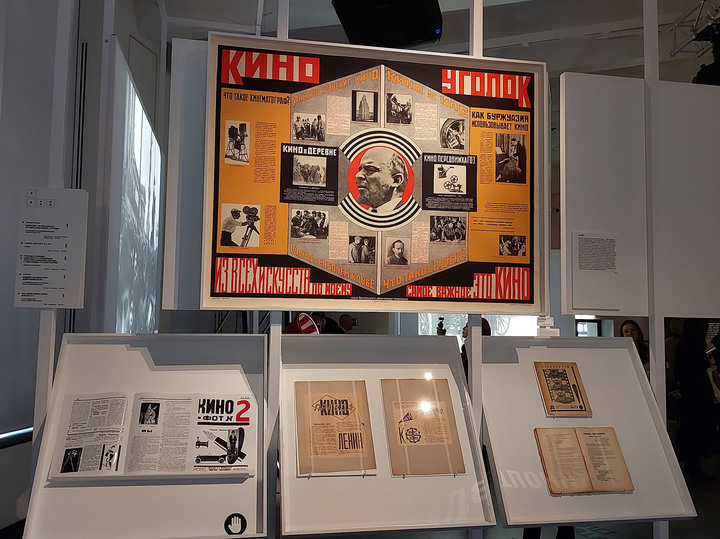 В 1974-м была и другая выставка, созданная женой Вертова, монтажером, режиссером Елизаветой Свиловой, в ГДР. Ее показали в нескольких европейских странах. Авторы выставки в центре «Зотов» про «дико модного Вертова», «фрика своего времени», сделали ее по образу и подобию бобины кинопленки, которую можно обойти по кругу.