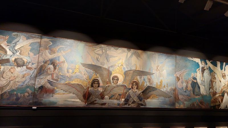 В одном из залов сооружен высокий помост, напоминающий балкон или высокую террасу, откуда можно обозревать картоны триптиха «Радость праведных о Господе». Они созданы Васнецовым для росписи барабана главного купола собора св. Владимира. Это самая грандиозная часть экспозиции. Посетители возвращаются к ней вновь и вновь.