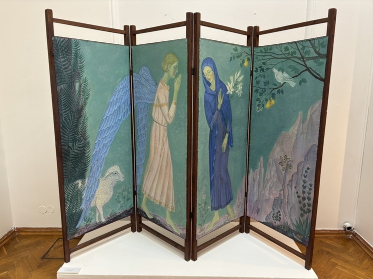 Другой сюжет, не менее эмоциональный и жизненный, изображен на ширме «Благовещение», где ангел шепчет Марии благую весть. Образы и ангела, и Богородицы невероятно живые, человеческие — не за счет реалистичного изображения, а за счет лица героини: будущая мать, зная судьбу своего ребенка, опечалена, с одной стороны, — взгляд ее полон трагизма, — но и огонек счастья внутри нее тоже зажжен — отсюда и яркий румянец на щеках.
