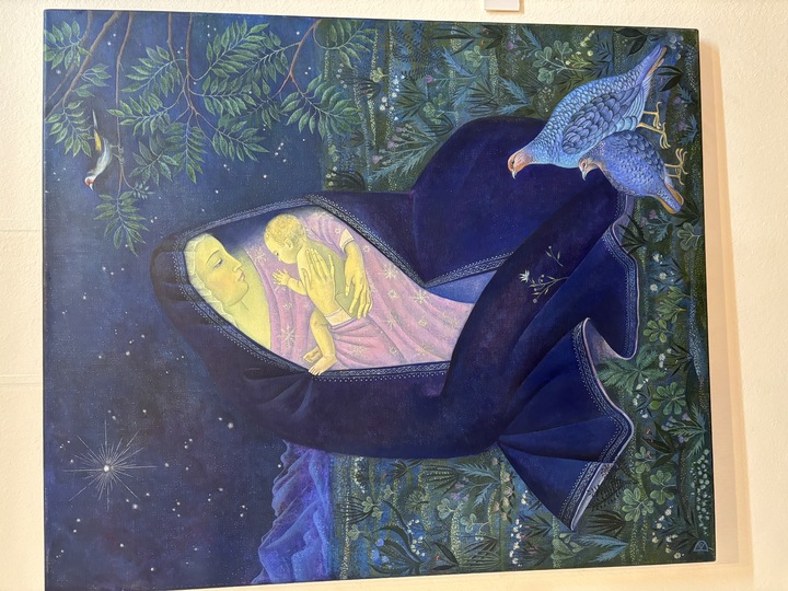 Два десятка работ на выставке Дроновой предлагают взгляд на евангельские сюжеты, но через призму, нам понятную и близкую, ведь Иисус и Мария — тоже люди, и все людское им не было чуждо. Очень простой и ясный образ — «Ночь в Вифлееме». Дева Мария с сыном на руках излучают свет, сияют, а все вокруг погружено во тьму. Но ведь и у нас так же: маленькие, мы чувствовали защиту, тепло и абсолютную безопасность в маминых объятиях. Вспомните себя в детстве (да и сейчас): к кому мы бежали в случае чего? Кого мы зовем, испугавшись, в надежде на помощь?..