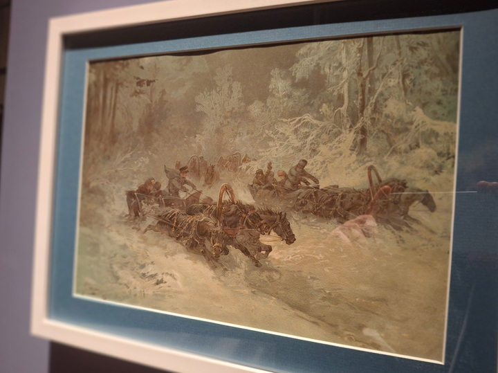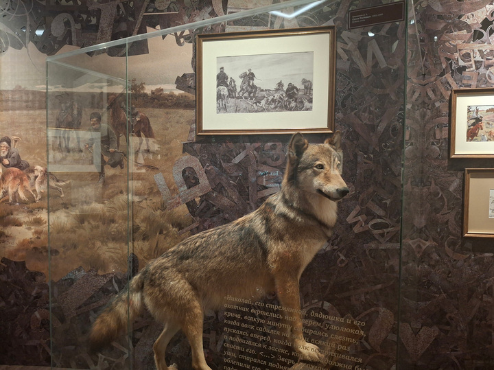 «Открыточный» волк, кстати, в павильоне был замечен еще раз — в основной экспозиции есть чучело зверя, книжного собрата которого преследовали Ростовы в эпизоде об охоте в Отрадненском лесу.