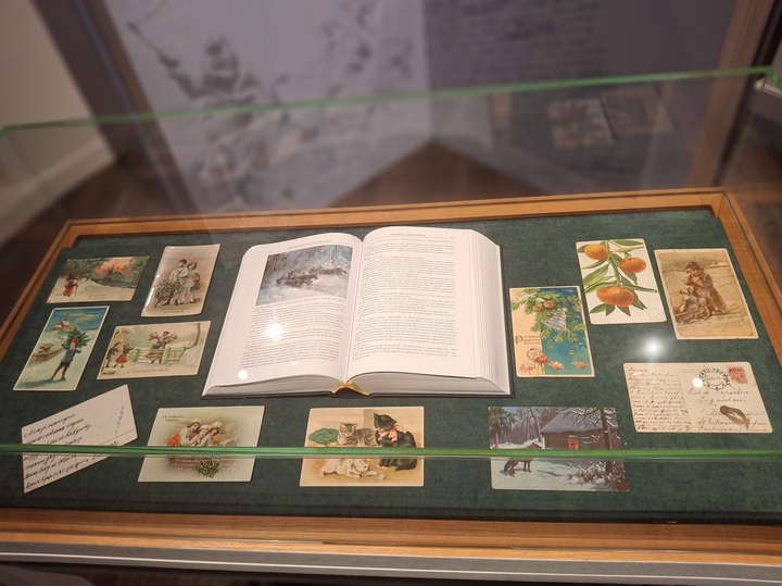 На цитатах из романа и иллюстрациях к нему построена, конечно же, и временная святочная выставка, малая по объему, как все проекты такого формата. Помимо подборки дореволюционных открыток с рождественской елью, волком, смотрящим в окно залитого светом дома, мальчиками и девочками с салазками, котятами и прочей милотой, на ней представлены картинки к отдельным главам и сценам романа.