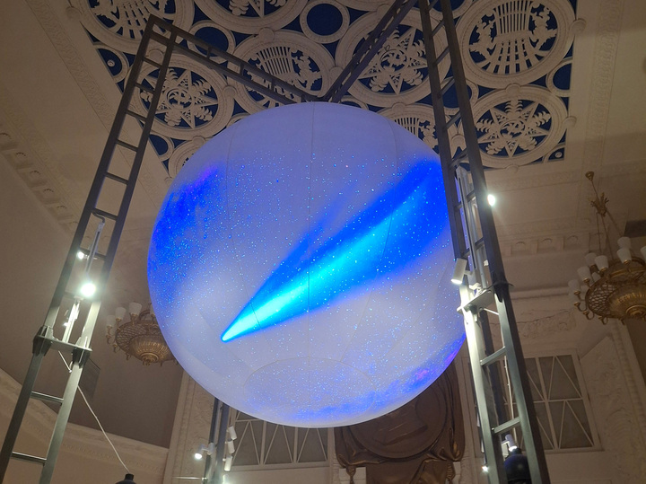 И здесь нужно заметить, что пространство для временных выставок располагается под светящимся шаром, являющимся смысловым ядром «Оживших страниц». На него транслируется видеоарт, включающий образ Великой кометы 1812 года, и «нарезку» философских цитат из «Войны и мира».