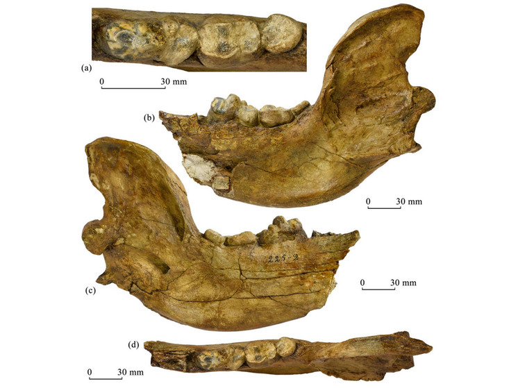 Фрагмент левой нижнечелюстной кости Huracan borissiaki Lopatin, 2025 из верхов миоцена Косякинского карьера в Ставрополе, с разных сторон. Фото: Палеонтологический институт им. А.А. Борисяка РАН