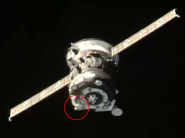 Корабль «Прогресс-МС 33» перед стыковкой. Выделено место нераскрывшейся антенны. Кадр из трансляции Роскосмоса
