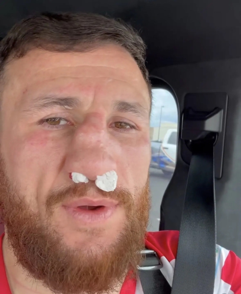 Боец поделился неприятностью в соцсетях, опубликовал видео и фото с перекошенным носом. Он также показал снимки лица, на которых хорошо видно искривление.