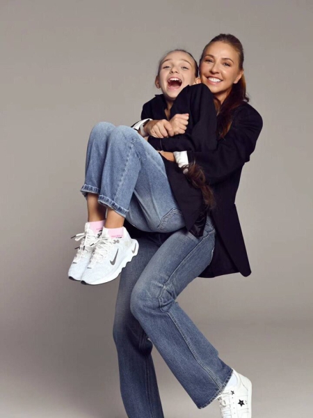 Для съемки мама и дочка выбрали одинаковые комплекты одежды. Они нарядились в голубые джинсы, черные пиджаки и белые кроссовки. Татьяна и Надежда сделали похожие прически, что подчеркнуло их внешнее сходство. На фото мать и дочь смеются и обнимаются.