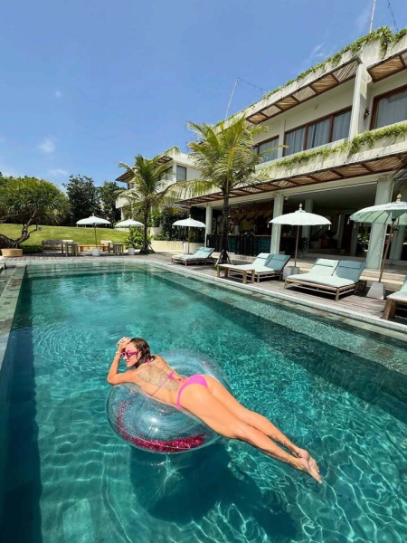 Среди фотографий, опубликованных Светланой, были редкие снимки в розовом бикини. Теннисистку сфотографировали в бассейне, где она плавала на надувном матрасе в виде ракушки.