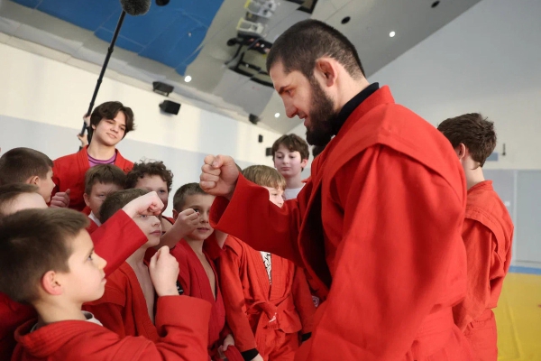 В зал вошел президент ФИАС Василий Шестаков, широкая спина которого скрывала дорогого и редкого гостя. «Здравствуйте, ребята», — поздоровался с юными самбистами глава Международной федерации этого вида спорта, — Смотрите, кого я вам привел? Узнаете?». «Даа», — раздался протянутый громкий возглас десятков детских голосов. «Это один из лучших представителей нашего вида единоборств в мире, действующий чемпион UFC в полусреднем весе и лидер рейтинга ведущей организации в смешанных единоборствах вне зависимости от весовых категорий, Ислам Махачев», — представил атлета ребятам Шестаков.