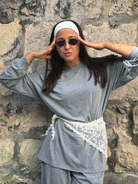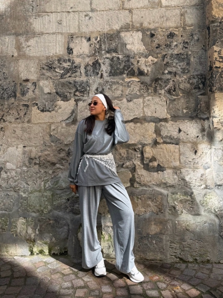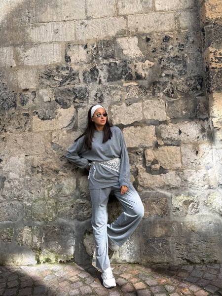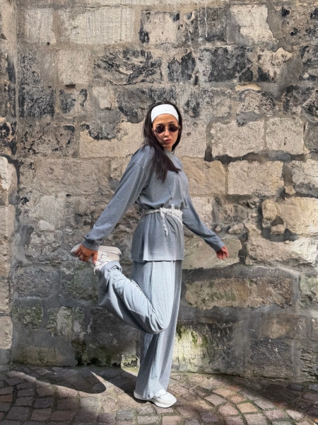 На спортсменке наряд, в котором сочетаются спорт, женственность и кокетство. Рахимова одета в серый трикотажный костюм, состоящий из широких брюк и лонгслива.