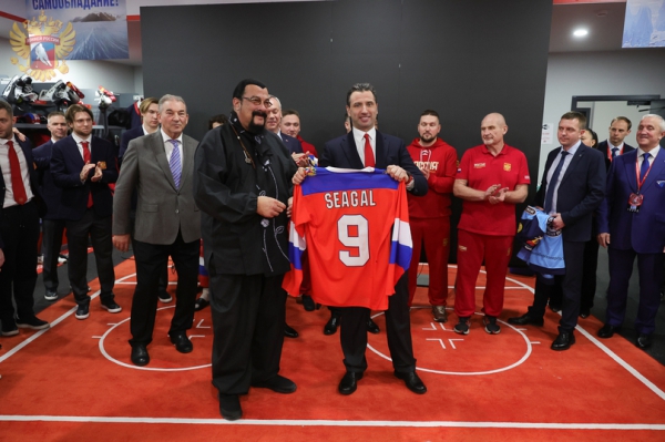 Кумир миллионов зрителей и экранный спаситель Америки затем стал главным действующим лицом в раздевалке нашей сборной, где ему вручили свитер сборной России с 9-м номером.
