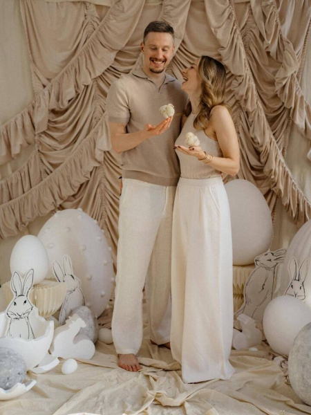 Съемка прошла в фотостудии, где в интерьере преобладали белый, розовый и бежевый цвета. Яна, Михаил и София оделись в такой же цветовой гамме.