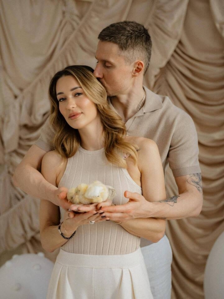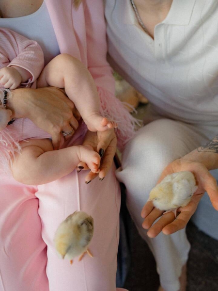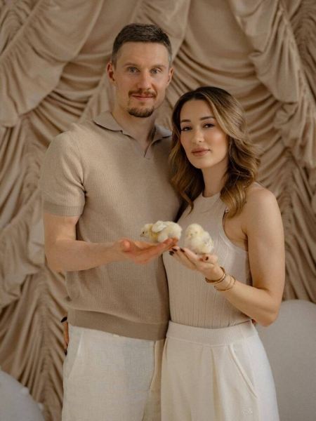 Супруги снялись вдвоем, с маленькой дочкой, а также с очаровательными партнерами-животными. В фотосессии задействовали цыплят и белого козленка.